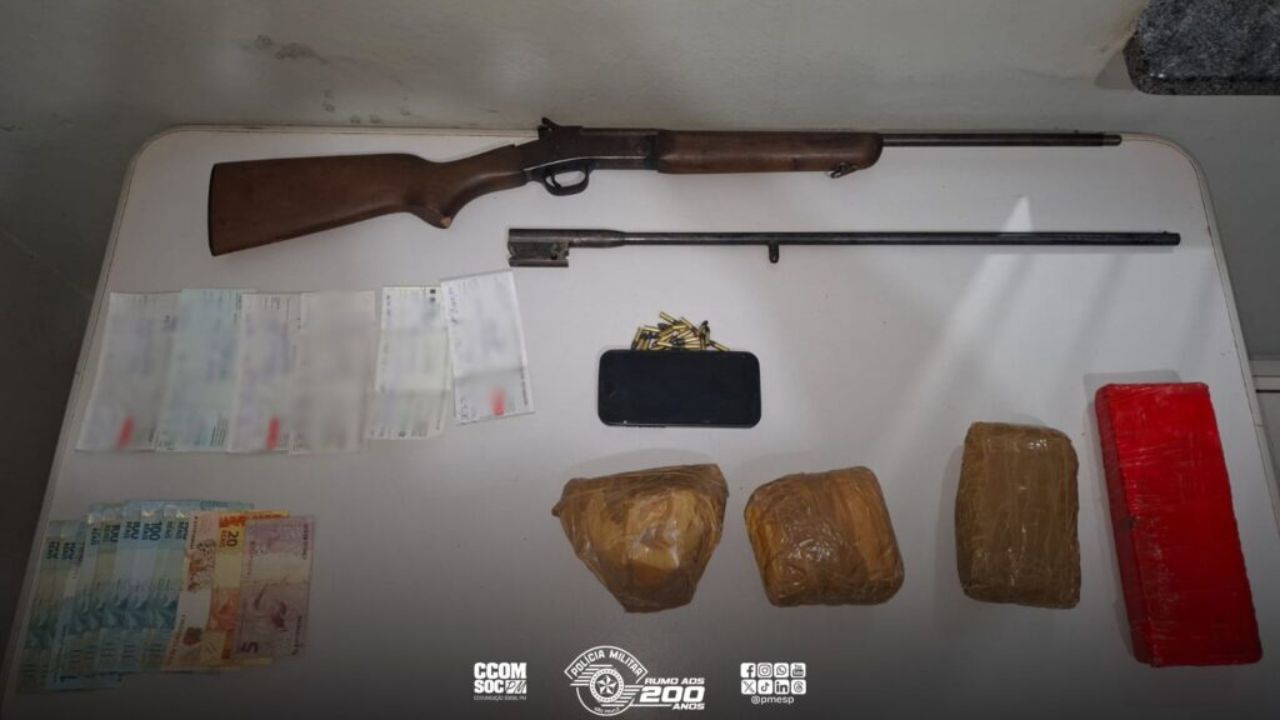 Durante a averiguação de uma denúncia de tráfico de drogas e porte ilegal de arma de fogo, a Polícia Militar prendeu um homem em flagrante, na última sexta-feira (26), em Casa Branca/SP.