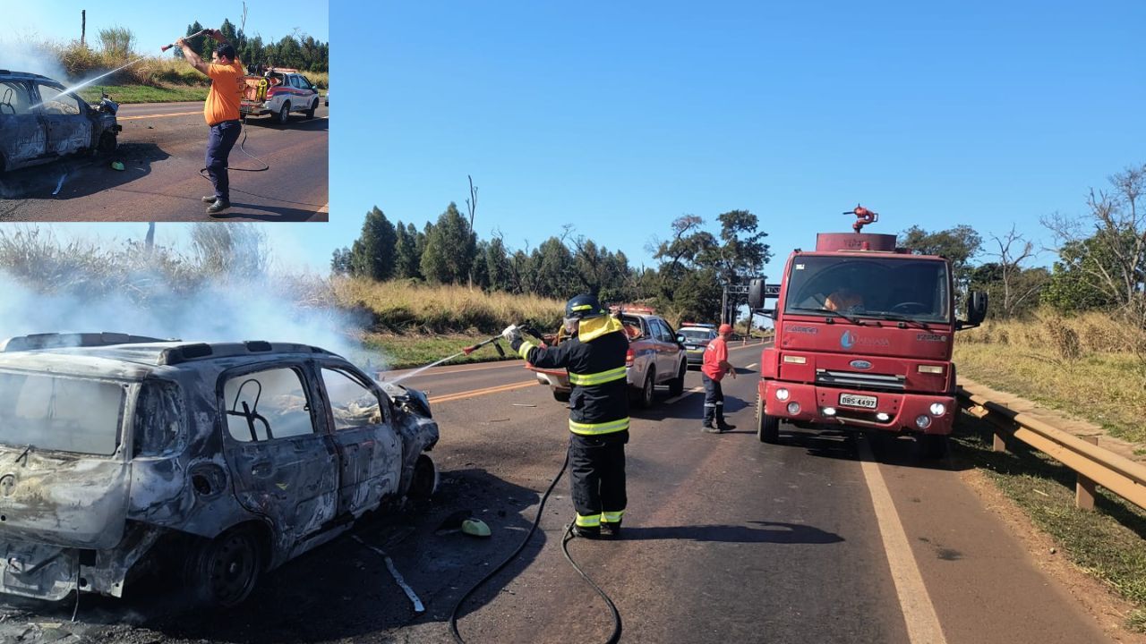 As imagens enviadas por um seguidor da Rádio Jota Notícias mostram o carro totalmente consumido pelas chamas às margens da rodovia. A cena impressionou quem passava pelo local.