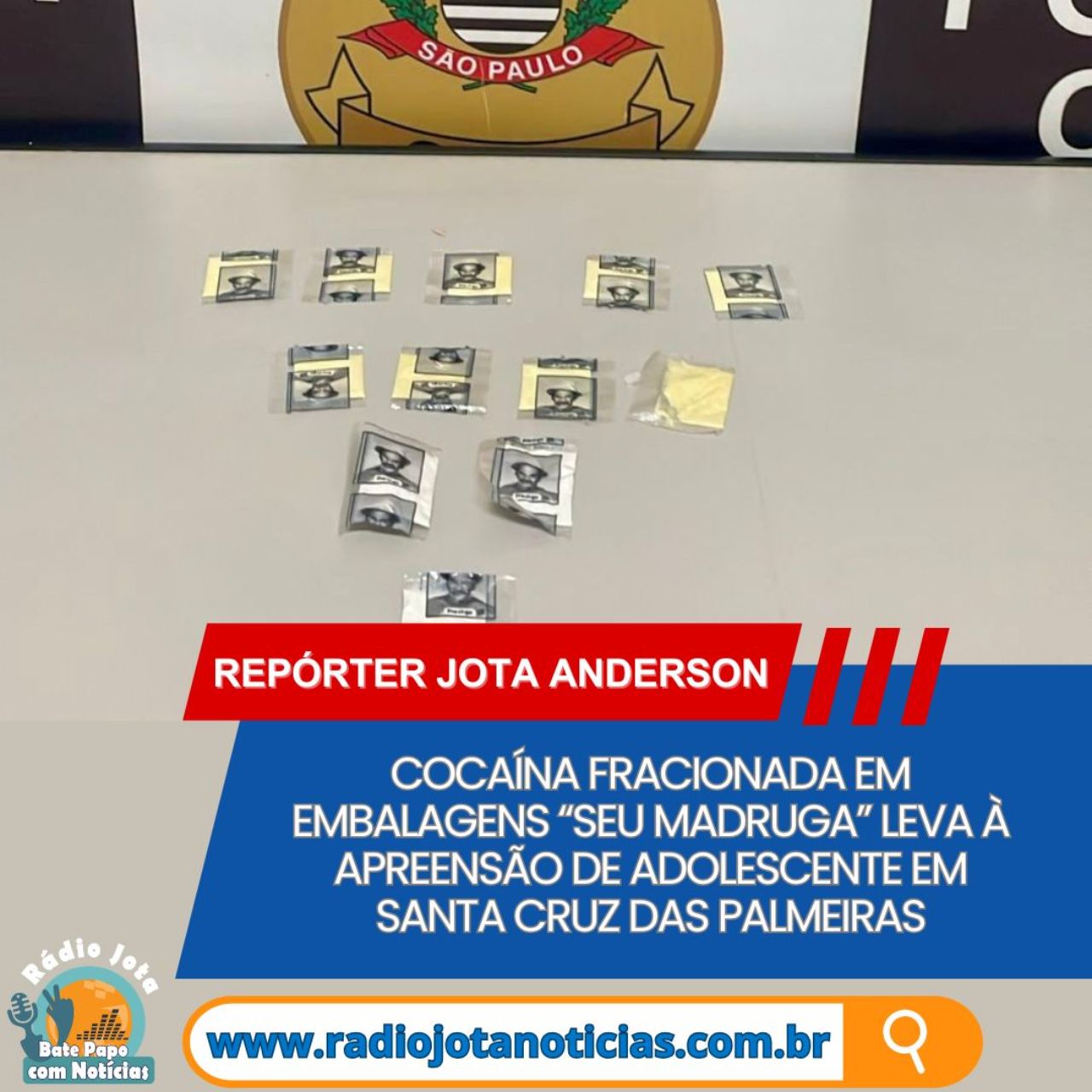 Foram apreendidas 12 porções de substância análoga à cocaína, acondicionadas de forma individualizada, parte delas com identificação gráfica padronizada (“Seu Madruga”), indicativa de comercialização.
