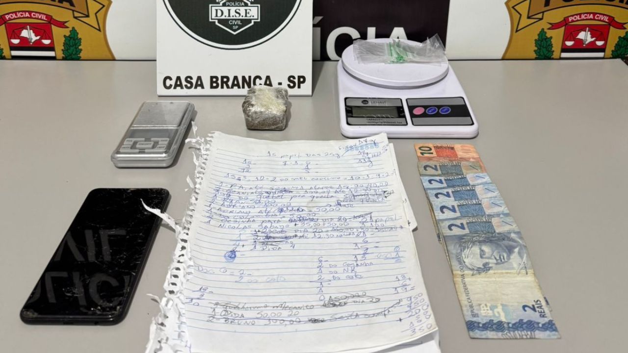 De acordo com a corporação, durante diligências os policiais surpreenderam o suspeito em sua residência mantendo um tablete de maconha, balanças de precisão, anotações relacionadas à contabilidade da venda de entorpecentes e diversas embalagens plásticas comumente utilizadas para o fracionamento e comercialização da droga.