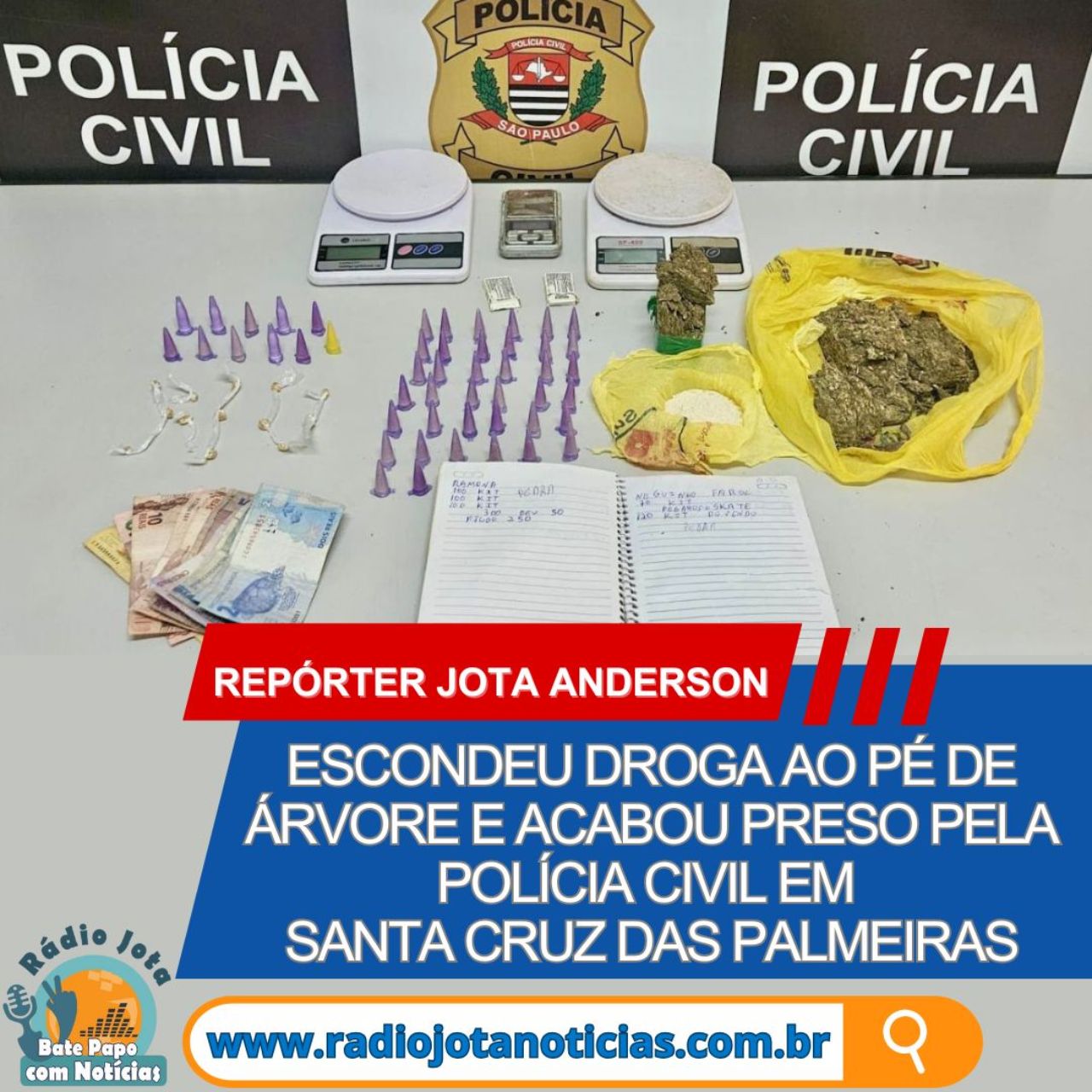 A Polícia Civil de Santa Cruz das Palmeiras prendeu em flagrante, nesta semana, um homem de 37 anos por tráfico de drogas. A ação faz parte de um trabalho contínuo de investigação voltado ao combate ao tráfico no município.