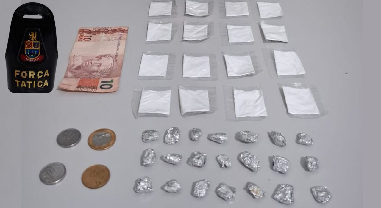 Os policiais localizaram, dentro de uma gaveta de um rack na sala, 24 pedras de crack, 16 porções de cocaína e R$ 12,25 em dinheiro, todos os entorpecentes acondicionados em um maço de cigarro.