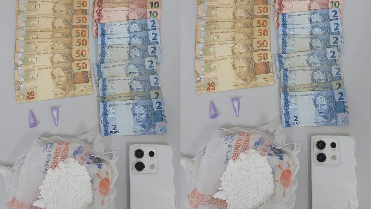 Durante a abordagem, os agentes revistaram o veículo e encontraram dois pinos de cocaína, além da quantia de R$ 394,00 em dinheiro. A sacola arremessada foi recuperada e continha uma porção maior da droga, totalizando 52 gramas de cocaína pura.