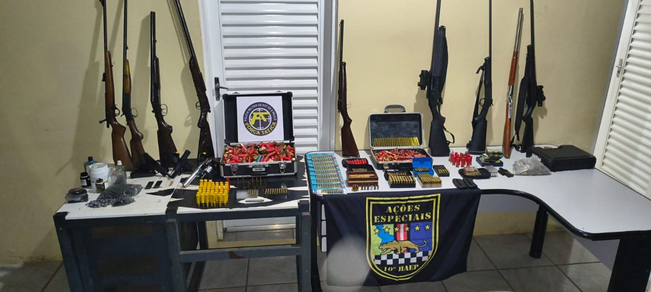 No local, foram apreendidas 12 armas de fogo, entre espingardas, carabinas, pistolas e revólveres de diversos calibres, além de dois armamentos de fabricação artesanal. Também foram encontradas mais de 1.200 munições de variados calibres, algumas de uso restrito.