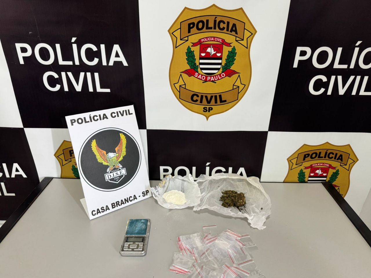 Na tarde desta segunda-feira (6), agentes da Delegacia de Investigações Sobre Entorpecentes (DISE) de Casa Branca surpreenderam um jovem de 18 anos em flagrante com cocaína e maconha a granel, além de uma balança de precisão e embalagens utilizadas para acondicionamento de drogas. A ação aconteceu no Parque São Paulo, em Casa Branca.