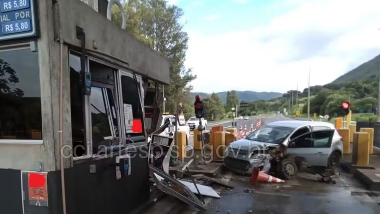O carro colidiu inicialmente contra a barreira de concreto e, na sequência, atingiu a cabine de cobrança manual. Apesar da gravidade da situação, ninguém ficou ferido.