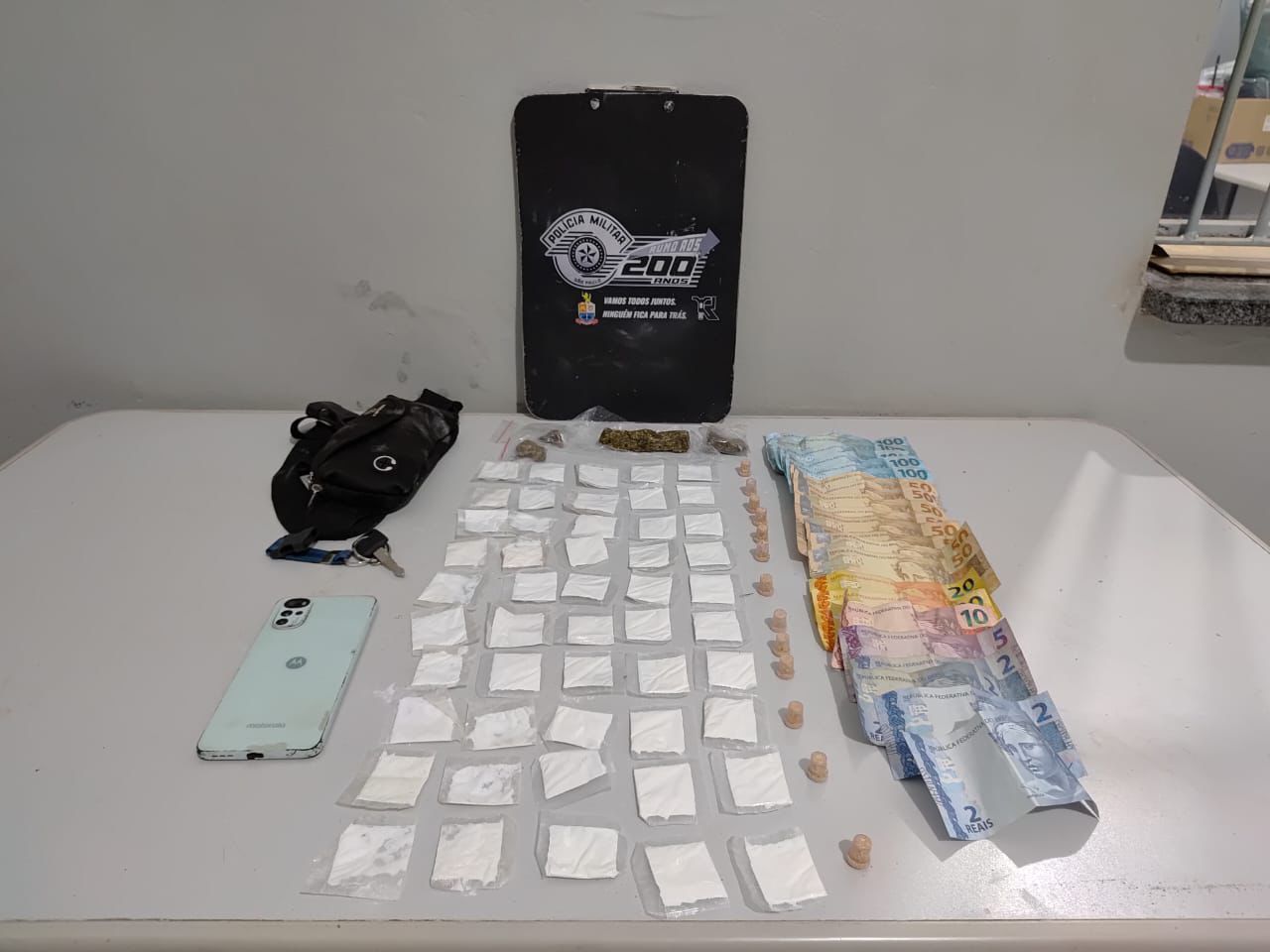 O primeiro foi encontrado ainda com a pochete, onde estavam 51 papelotes de cocaína (46,56g), 13 pinos de crack (8,51g), 4 porções de maconha (37,79g) e R$ 963,00 em dinheiro. O homem resistiu à abordagem e precisou ser contido.