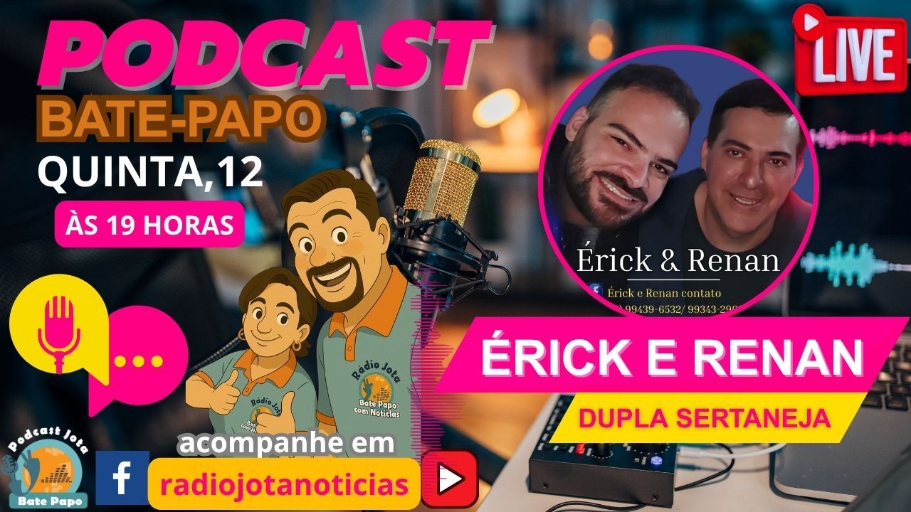 O Podcast Bate-Papo prepara uma edição pra lá de especial nesta quinta-feira, 12 de junho, a partir das 19h. Para celebrar o Dia dos Namorados, os apresentadores Jota Anderson e Sisi recebem a dupla sertaneja Érick e Renan para um programa cheio de boa música, descontração, sorteios e curiosidades sobre a trajetória dos artistas.