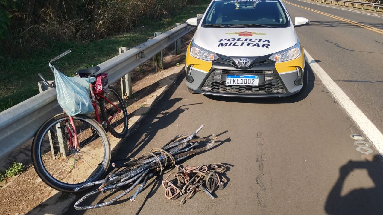 A ação teve início por volta das 15h25, quando os policiais avistaram um homem transitando em uma bicicleta e carregando uma quantidade significativa de cabos de fiação elétrica. Ao perceber a presença da viatura, o suspeito demonstrou nervosismo, o que motivou a abordagem imediata.