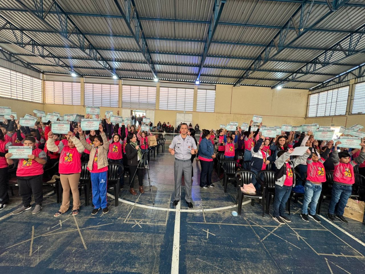 Ao final da cerimônia, todos os formandos receberam o Certificado PROERD, documento que oficializa a participação no programa e reforça o compromisso de cada criança em manter-se longe das drogas e da violência.