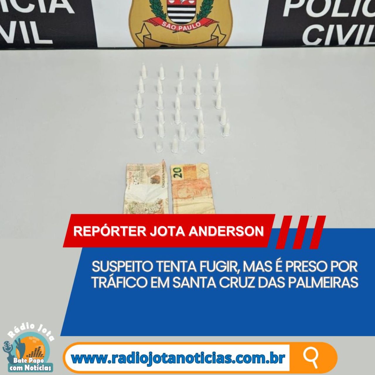 A Polícia Civil de Santa Cruz das Palmeiras prendeu em flagrante, nesta quinta-feira (26), um homem de 26 anos por tráfico de drogas durante diligência realizada no Conjunto Habitacional Dúlio Posse.