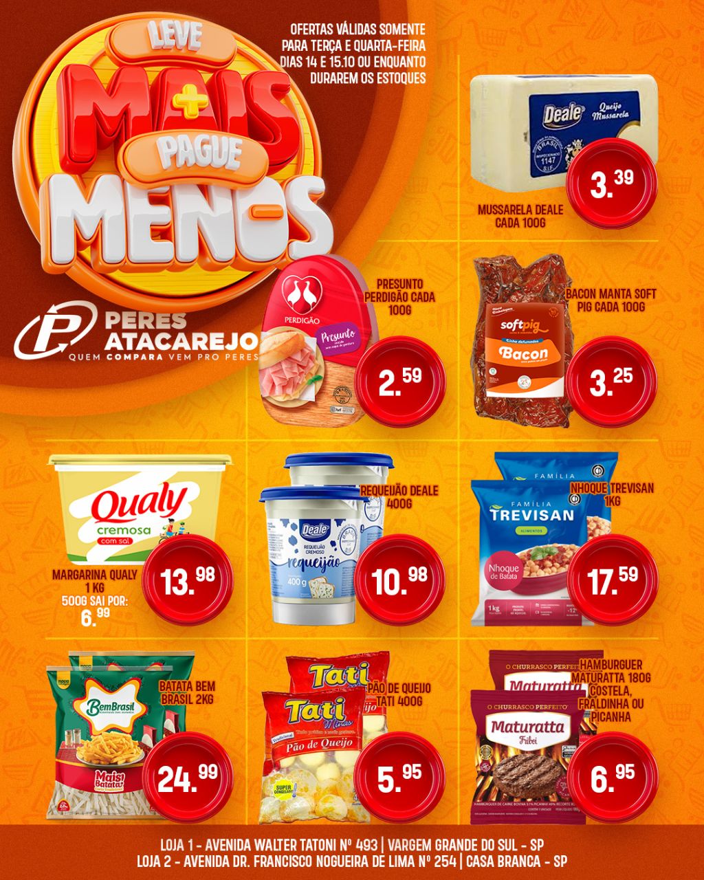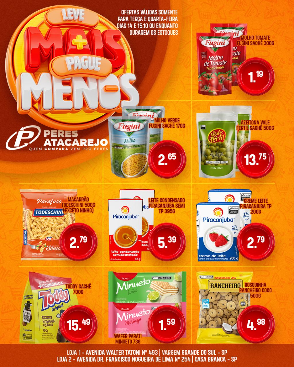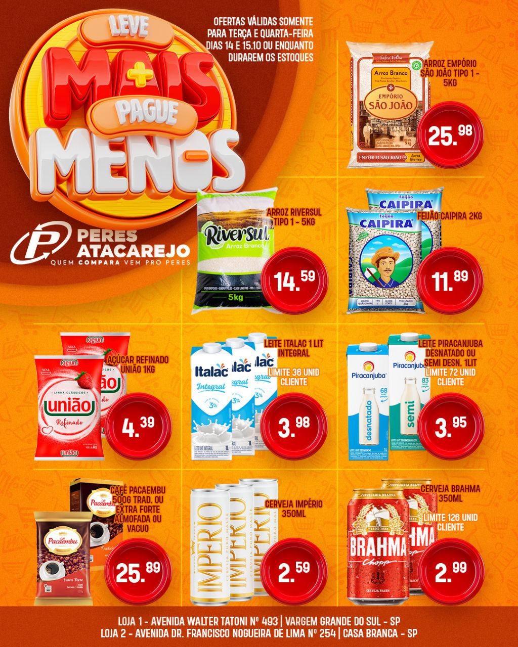 O Peres Atacarejo preparou dois dias especiais pra você economizar de verdade! Nesta terça, 14 de outubro, e quarta, 15 de outubro de 2025, tem ofertas exclusivas em produtos selecionados que cabem no seu bolso e enchem o carrinho de economia!