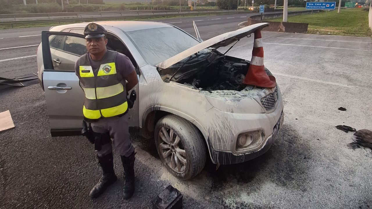 Demonstrando rapidez e eficiência, o policial abordou dois caminhões que passavam pelo local e utilizou os extintores de incêndio dos veículos para controlar o fogo. Após extinguir as chamas, ele tomou medidas adicionais de segurança, como desligar a bateria do Kia/Sportage e isolar o perímetro, garantindo a proteção de todos os envolvidos.